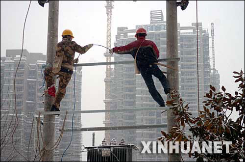 1月28日,在安徽省合肥市黄山路上,电力工人冒雪维护电力设施。