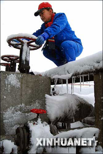 1月28日,地处江苏扬州的江苏油田一名女工在冒雪调节阀门。