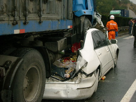 据大货车司机介绍,事发前,他的车行驶在白色小轿车后面,突然小轿车撞上了前面的货车,这时他的车离小轿车还有二三十米,他连忙踩刹车,但刹车突然失灵,大货车径直冲向小轿车。据该司机说,由于当时天下着雨,路上很滑,所以才导致刹车失灵。