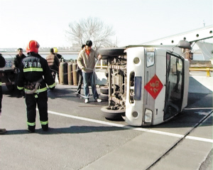 “是消防队吗?新华路立交桥有个货车翻了。”昨天上午,塘沽消防队的警铃骤然响起。报警人说,这辆货车上运载着几个燃气罐。消防员赶到现场看到,这辆货车侧翻在地,车内司乘人员都已经平安逃生,但是,货车的油箱破裂,大量油料倾泻而出,现场弥漫着刺鼻的油料味。此外,车上运载的七八个燃气罐也横七竖八倒在地上。这些燃气罐中,绝大多数都装载了40公斤的燃气。