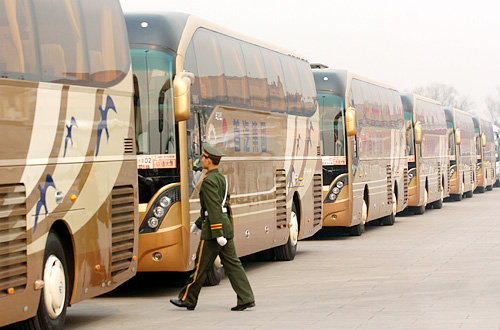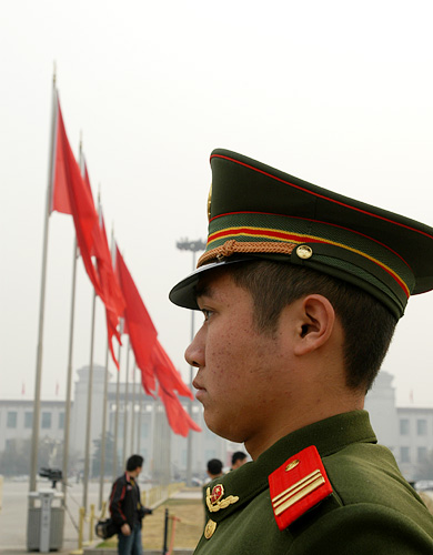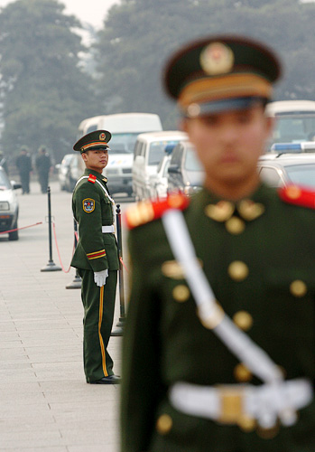 2008年3月8日9时,全国政协十一届一次会议举行第二次全体会议。图为当天在广场上值勤的武警战士。新华网 陈竞超 摄
