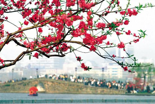 西湖的桃花广植在苏堤、白堤、孤山北麓和曲院风荷至镜湖厅的沿湖堤段,而最引人注目的就是白堤和苏堤了。每当桃花盛开时,两堤游人如织。这里的桃树与垂柳间种,一株杨柳一株桃,树树桃花间柳花,产生了极有层次的景观效果。在那儿观赏桃花,确实是一件赏心悦目之事。俗话说:“杏花宜在山坞赏,桃花应在水边看”。盈盈碧水映桃花,花光水影,娇艳欲滴。春天的早晨,湖面薄雾似纱,堤上烟柳如云,在鸟语花香中漫步,更令人飘然欲仙。