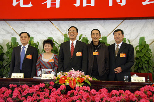 2008年3月12日15时在人民大会堂新闻发布厅举行政协十一届一次会议记者招待会,主题是“政协委员谈奥运”。刘敬民、崔大林、张景安、张艺谋、邓亚萍五位委员将出席记者招待会并回答记者问题。图为五位委员在主席台上合影。