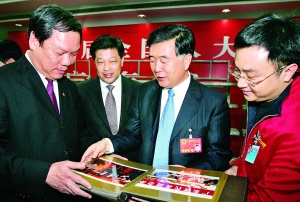 汪洋仔细翻看南方日报赠送的两会画册,本报总编辑王春芙(左一)作介绍。