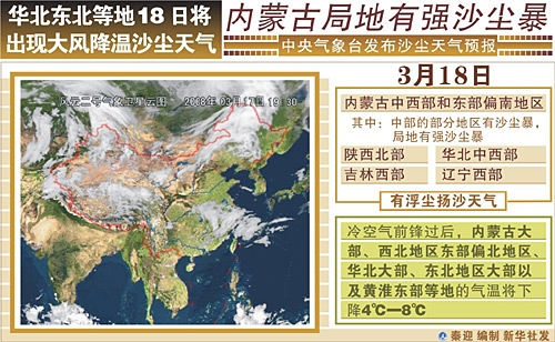 | 华北东北等地18日将出现大风降温沙尘天气 内蒙古局地有强沙尘暴 |