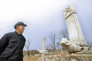 “从我记事起,这座园寝便有盗墓匪强行盗墓。上世纪三十年代,地宫便已被盗空,除了两座石碑,几乎什么都没剩下。”经过不知多少次洗劫后,距离功德碑百余米的地宫已面目全非,空地上仅留下一座高于地面的土堆和几棵高耸的松树。两座石碑的气派虽然不如往昔,但从碑身上仍能依稀看出当年园寝的气势磅礴。
