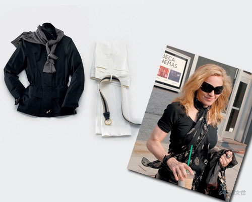 搭配Tips:很酷的麦姐选择印有骷髅图案的黑色丝巾,简单地打结,配以黑色装束。