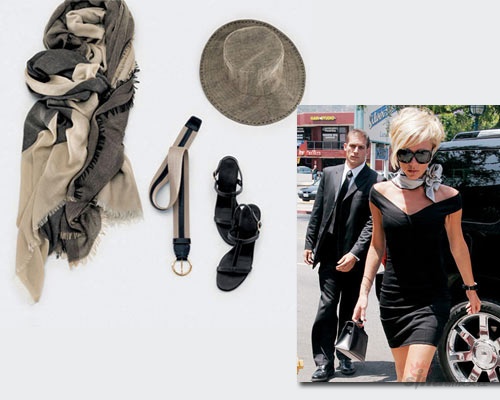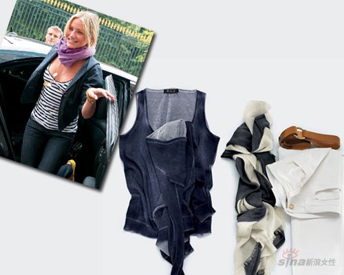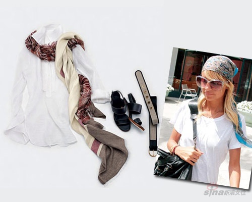 搭配Tips:最爱丝巾的Nicole Richie,把素净图案的大丝巾随意缠绕在脖子上,搭配最简单的白色无袖背心。