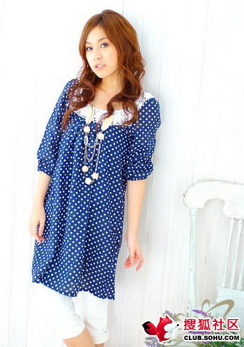 圆点图案的连衣裙给人活泼的感觉,避免了蓝色的沉闷。而雪纺的材质给人浪漫的印象,把你打造成一个浪漫活泼的小女人。
