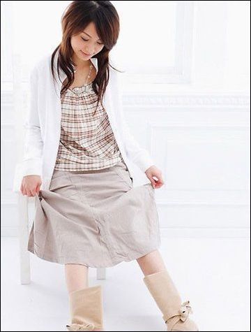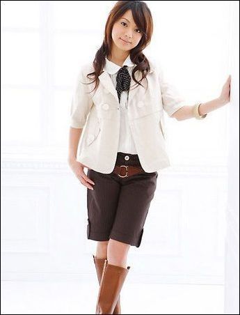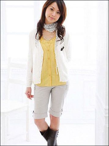 正黄色的布衫搭配白色的针织开衫,搭配灰色的短裤,黄色就成为了亮点,整体色调清淡,洋溢着文静的感觉。