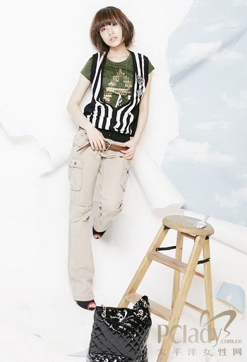 如果喜欢舒适帅气的打扮,阔脚裤就是不错的选择。上半身应该选择帅气却不失女人味的装束,所以用竖条纹的背心去中和。记住,倘若真的穿成个男孩子的装扮,是没有人喜欢的。所以需要适度的女人味。