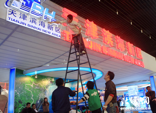 在组委会有关负责人的引领下,记者参观了尚未收工的国际展览中心布展现场。与往届相比,记者最大的感触就是各展区分布整齐,设计统一。其中,滨海新区作为本市推介展示重点,展区坐落在一号馆一层的入口处,其周边分布着开发区、保税区、天津港集团及塘沽、汉沽、大港等展区,以图片、模型、多媒体等多种形式,突出展示滨海新区发展规划、发展前景和重大发展项目,全方位推介滨海新区良好的投资环境和投资政策。中粮集团展区也坐落于此,从展区的布置到展品的推出无不充分展现出中央大企业的气势与风范。