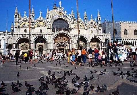 威尼斯的圣马可广场,人潮涌动,在川流不息的人群脚下,是一群群悠闲迈步的鸽子,比起那些东张西望张大嘴巴的的游客,它们更像这里的主人。主人对客人的好客是显而易见的。欧洲的广场鸽没有怕人的传统。它们和人永久地和谐相处似乎更甚于人与人之间的亲密程度。有一瞬间,我满眼都是身旁快乐飞旋起落的鸽子,竟然忘记了眼前圣马可大教堂的辉煌和魅力。