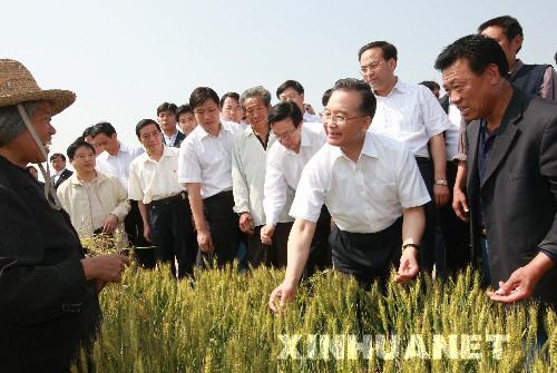 5月10日至12日,中共中央政治局常委、国务院总理温家宝到河南南阳市的西峡、内乡县等地考察。他深入田间地头,走访学校、医院、企业和农户进行调查研究。这是5月11日温家宝在内乡县赵店乡察看小麦生长情况。
