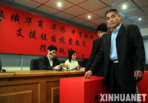 5月14日,在俄罗斯首都莫斯科,一位旅俄华商向祖国地震灾区捐款。当天共有120位旅俄华侨、华商、中资企业代表参与捐款,捐款逾12万美元。新华社记者赵嘉麟摄