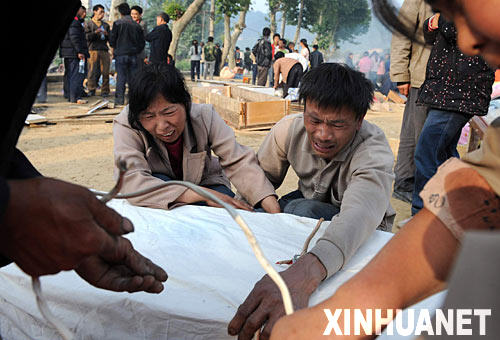 5月15日,木鱼中学学生彭建荣的父母在儿子遗体前悲痛万分。在汶川地震中,四川省青川县木鱼中学275名学生死亡,30名学生下落不明。