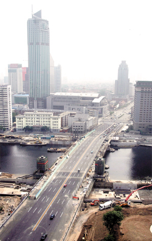 在桥梁相继开通的同时,海河周边道路建设也进入冲刺阶段。作为海河上游区域的两条交通大动脉,海河西路已基本实现贯通,海河东路改造已接近尾声,奥运会之前,这两条道路将全面贯通,从而使海河上游段的三岔河口与海津大桥之间形成双向通车,为过往车辆节省至少一半的通行时间。