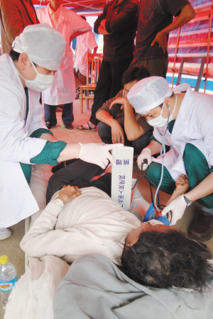 我们一行52人分成两个分队,第一队26人前往广元410医院,我们第二小分队于中午11点左右来到广元市中心医院,一进到医院就看到许多的帐篷搭建在医院的院子里,据医院的职工告诉我们:就在你们到来的20分钟前刚刚把医院的几百名患者送回病房。
