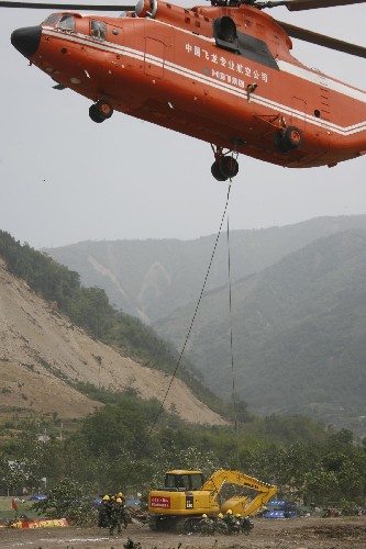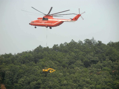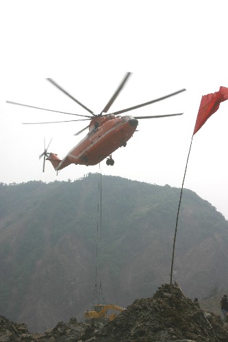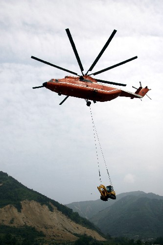 | 5月26日,米-26直升机将挖掘机吊运到唐家山堰塞湖坝顶。当日,一架米-26直升机从绵阳机场起飞,经擂鼓镇吊运起挖掘机等重型设备空投至唐家山堰塞湖坝顶。这标志着唐家山堰塞湖空中抢险通道已经打通,随着大型机械设备的不断空投运进,抢险工作将提速。 |