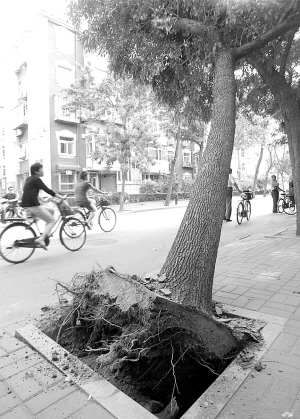 记者在现场看到,同安道和平区一侧,一棵10多米高的大树歪靠在另一棵树上,树根大部分露出土外。据和平区园林部门的一名工作人员介绍,这棵大树是白蜡树,大约有20年的树龄,园林部门会立刻对这棵大树进行补栽。