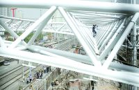 作为京津城际铁路延伸至滨海新区的配套工程,塘沽火车站的大规模改造工程接近尾声。图为施工人员正在对站台上刚刚改建好的无柱雨蓬进行粉刷。
