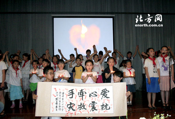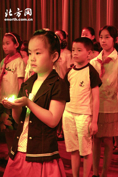 | 尖山小学“六一”联欢会上,同学们点燃蜡烛为灾区小朋友们祈福 |