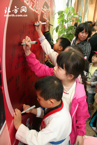 华夏未来双语幼儿园树立了一面“爱心漂流墙”,在这条近百米横幅上,该园500余名小朋友绘制了美丽的图画,祝福灾区的小朋友今后建设出更加美丽、更加富饶的新四川。