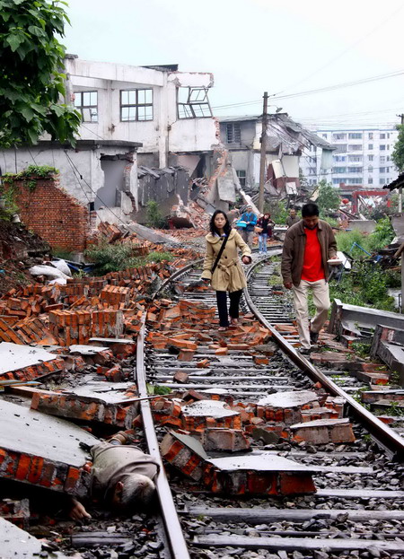 5月13日,记者在四川德阳地区绵竹市汉旺镇的东方汽轮机厂拍摄的一段受损的铁路。