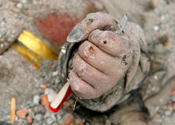 这是5月16日晚拍摄的四川省绵竹市汉旺镇东汽中学发掘现场的一幕――一名死难学生手里紧紧攥着一支笔。