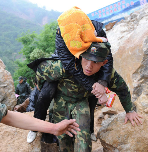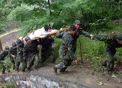 5月13日,救灾官兵在北川县冒着遭遇塌方和余震的风险,克服重重困难抢救受伤百姓。地震造成四川北川县老县城80%、新县城60%以上建筑垮塌,人员伤亡惨重。