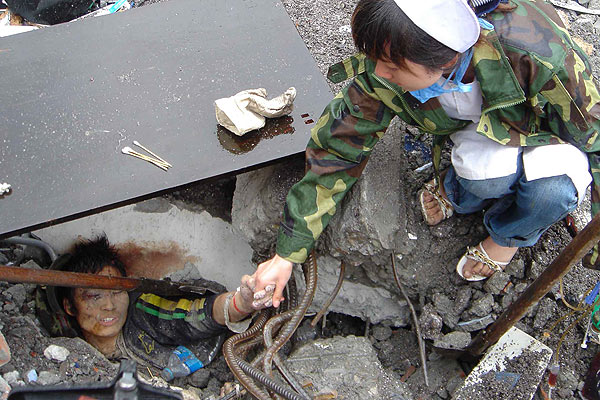 5月13日,一位护士不停地与一位被困孩子说话,鼓励他等待救援。