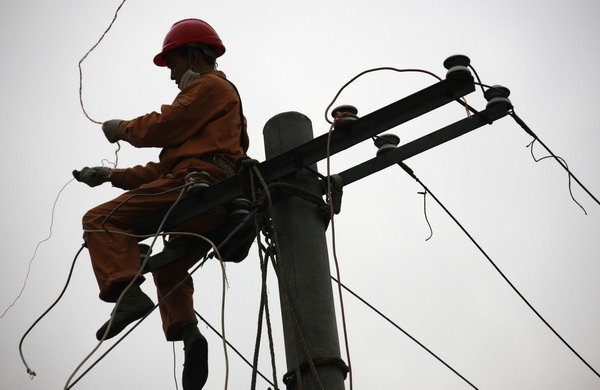 5月20日,一位电力工人正在修复安县至北川的供电线路。