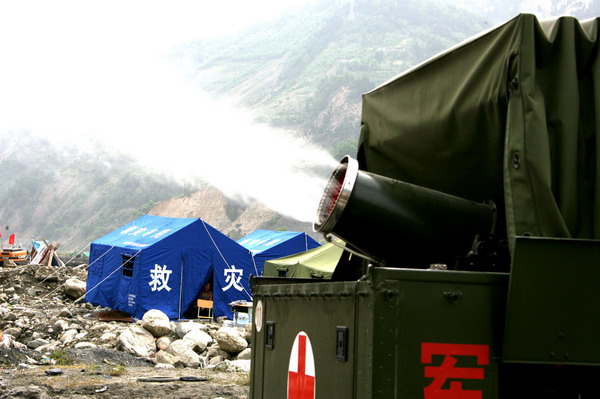 5月19日,解放军防疫队使用专用消杀车在汶川县映秀镇喷洒消毒药。