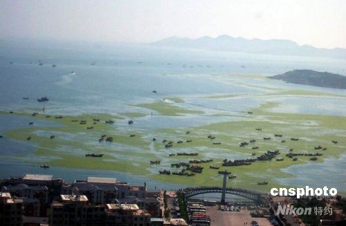 据了解,从五月三十一日开始,大批浒苔陆续飘进青岛海域,截至六月二十八日青岛近海实际浒苔覆盖面积为四百平方公里,奥帆赛警戒水域有浒苔面积十五点八六平方公里,占总面积的百分之三十二点0四。