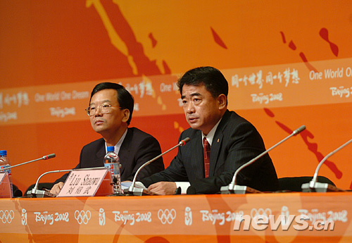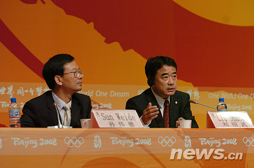 图为北京奥组委安保部部长刘绍武(右)回答记者提问。新华网 陈竞超 摄