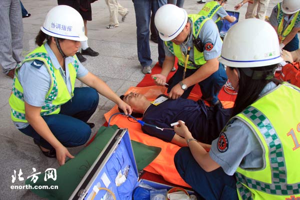 据介绍,参加此次演练的有天津急救中心、天津医科大学肿瘤医院、天津中医药大学第一附属医院、天津市胸科医院、天津市第四中心医院、天津市天和医院、天津市第三医院、天津市公安医院、天津市南开医院等单位共80人。