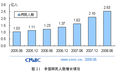 2008年7月24日,中国互联网络信息中心(CNNIC)在京发布《第22次中国互联网络发展状况统计报告》(以下简称《报告》)。报告显示,截至2008年6月底,我国网民数量达到了2.53亿,首次大幅度超过美国,跃居世界第一位。尽管如此,互联网普及率只有19.1%,仍然低于全球平均水平(21.1%)。