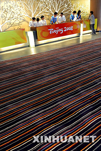 这是青岛奥运村接待大厅前铺设的彩色条状地毯(7月27日摄)。