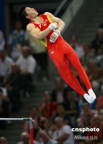 8月12日,中国队在北京奥运会体操男子团体比赛中以286.125 分勇夺金牌。图为李小鹏在单杠比赛中。