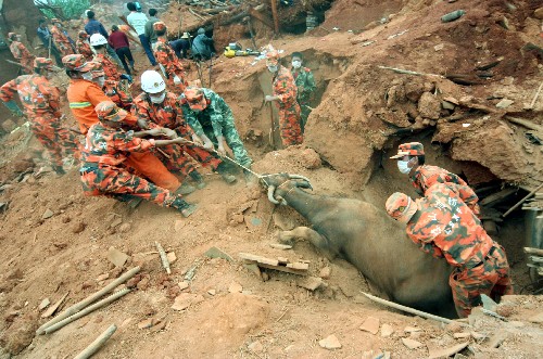 8月31日上午,凉山消防官兵在会理县黎溪镇新桥村转移遇难群众遗体。新华社发
