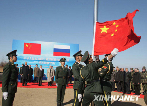 中俄界桩揭幕仪式上升起中华人民共和国国旗。