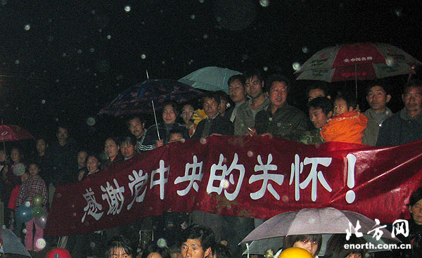 到达金山寺村的时候,已经是晚上6点多了。虽然下着小雨,但地坎、砖堆上到处站满了前来观看演出的群众。得知天津“海河情”艺术团要来演出的消息后,金山寺周边村落的2000多名受灾群众赶到演出现场;在金山寺参与援建的建筑工人师傅们刚刚结束施工,也专门赶来观看节目。
