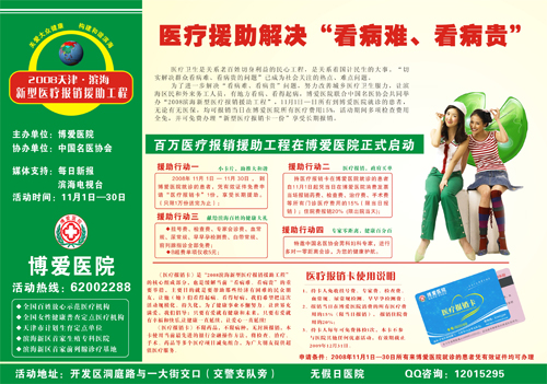 据医疗报销工程的主办单位——博爱医院李院长表示,去年“十一”期间,博爱医院已试行推广部分新医疗报销卡,数万名患者得到了实实在在的报销优惠,同时也得到了社会各界的一致好评和支持。今年“十一”医疗报销援助工程成功推出后,应广大患者强烈要求,并经有关部门批准,博爱医院定于2008年11月1日到30日,面向社会全面推广医疗报销援助工程,希望更多群众享受这项全新的惠民医疗措施,李院长说:“作为滨海新区唯一一家平价医院,为全区人民群众的健康服务是我们义不容辞的责任,实施医疗报销援助工程,推广新型医疗报销卡,主要目的就是要帮助那些经济有困难的民众朋友,减轻就医的经济负担,无病早防,有病早治,告别小病拖、大病扛的现象, 让他(她)们看得起病、看得好病,我们希望把这次活动规模化、持久化,为了健康事业不懈努力!”