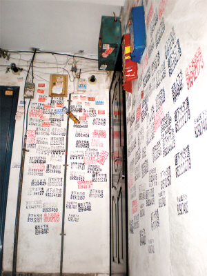 昨天上午,记者来到塘沽区正义里小区,一进楼门就看到位于楼道两侧的红色或黑色小广告,最为密集的地方则是居民的家门口,每个家门口两侧都被喷得密密麻麻的,更有甚者,连每层楼梯的顶层都被喷上这种小广告。据该小区居民陈女士反映,昨天晚上她下班回家时楼道里还没有这些小广告,就是在一夜之间,不同电话号码不同职业的小广告就把楼道喷得满满当当的,原来干净的墙面一下子变得“惨不忍睹”。记者仔细看了一下这些小广告,都是一些“开锁”或是“通上下水改道”的广告。
