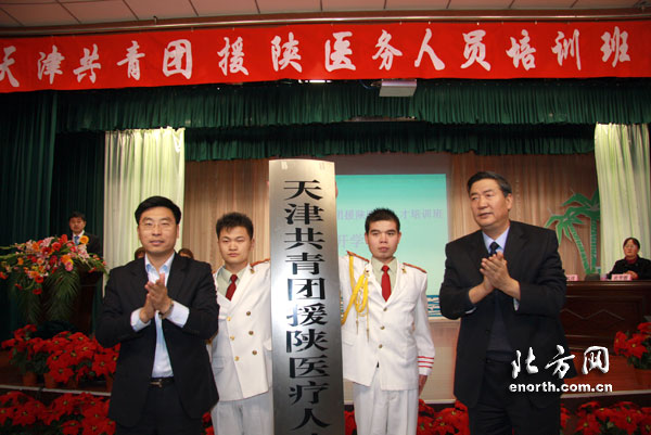 典礼仪式上,团市委副书记白凤祥、北门医院院长王维栋为“天津共青团援陕医疗人才培训基地”揭牌并向灾区医务人员赠送了医疗书籍和材料。白凤祥在开学典礼上作了热情洋溢的讲话。他说,津陕一家,陕西地震灾区时刻牵动着天津人民的心。灾后重建工作不仅关系到陕西人民的生存,更关系到陕西青少年的未来发展,天津将尽自己的一切力量,支持陕西的灾后重建工作,以各种方式帮助灾区人民。他希望培训班的学员抓住这次机会,努力学习,不断提高专业知识技能,回到家乡后更好地为灾区人民服务。