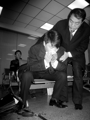 黄静的代理人周成宇和代理律师付占平一起来到朝阳法院,向法院递交向华硕讨名誉权索赔100万的立案申请,在排号机上取号后,周成宇与律师进入受理大厅等候。就在众人等待之时,刚才还在与律师交谈的周成宇突然口喷鲜血,令大厅内的人吃惊不已。有记者递给周成宇纸巾,擦拭嘴上的血迹,在律师的搀扶下,周成宇坐下,几次又出现呕血的状况。虽然他一直称没事,拒绝叫急救车,但脸色苍白,拿着纸巾的手也不住地颤抖。