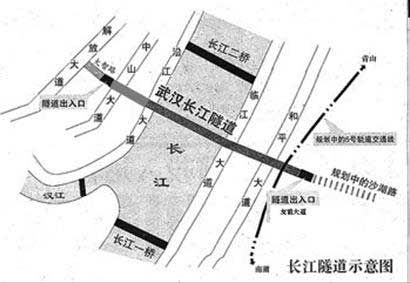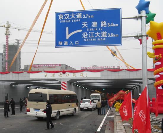 武汉长江隧道是“万里长江第一隧道”。北起汉口大智路铭新街口,下穿中山大道,经江底河床下10余米深处穿越长江,南连武昌友谊大道,并与规划的沙湖路相衔接。隧道全长3630米,双向四车道,设计时速为50公里/小时。同步配套建设供电、供水、排水、通风、照明、消防、人防、绿化、监控以及交通等设施,概算总投资20.5亿元。工程于2004年11月28日开工,2008年12月28日通车。