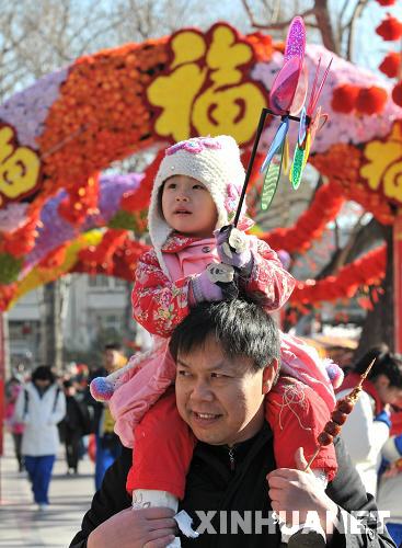 1月25日,一位父亲驮着孩子在北京龙潭庙会上游玩。2009年春节期间,北京将有30多家庙会、灯会向公众开放,除了地坛庙会、厂甸庙会等大型品牌庙会外,还新增了一些主题庙会和社区庙会、灯会,为京城的新春文化生活营造了热烈的气氛。