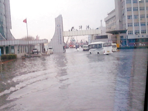 昨日清晨,风暴潮侵袭天津港,海水漫过客运码头涨到新港一号路上。部分单位的班车因此受到影响,一时无法进入港区。天津港一号卡子门附近,有百余辆汽车停在道路两旁,排成几十米的长队。海水漫上街道,坑洼处积水深达半米。路边有五六辆私家车“趴窝”,车主正站在水中推车。客运站内也有几辆大轿车,被潮水困住。