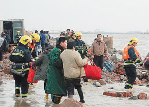 雨越下越大,为及时救出被困人员,先头的消防部门迅速决定,抛下消防车,19名消防官兵徒步携带救援工具奔赴现场。5公里的急行军后,消防员终于赶到了距离现场最近的大坝。“我们能看见人工岛,上面还有不少被困工人。”一名消防员用对讲机向后方汇报。接到“在保证自身安全的前提下,不惜一切代价救人”的命令后,5名消防战士将绳索拴在身上,沿着时不时露出水面的通道,涉海赶赴人工岛救人。当被困工人见到有人冒险上岛营救他们时,都流下了热泪。随后,工人们在消防员的帮助下,抓着绳索慢慢走上堤岸。在救援过程中,一名有5个月身孕的妇女让消防员犯了难,由于长时间处在低温状态下,这名孕妇已无法自行逃生。随后,3名消防员找来一块木板,用绳索将孕妇简单固定在上面,将这名孕妇慢慢抬出了人工岛。经过约1小时的救援,60名被困者全部获救,此时已是上午8时。